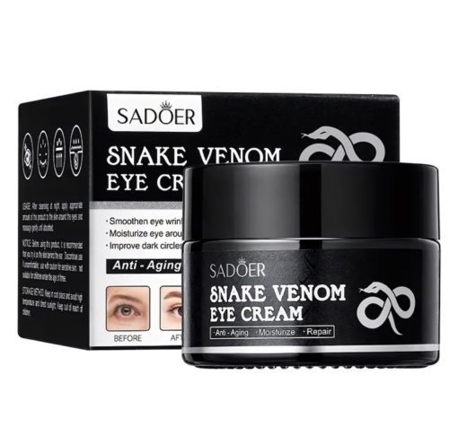 SADOER Snake Venom Eye Cream este o cremă intensă pentru zona ochilor, creată pentru a reduce liniile fine, ridurile premature, umflăturile și cearcănele. Formula cu venin de șarpe (sintetic) acționează asemănător unui efect „botox-like”, oferind netezire și un aspect mai ferm.